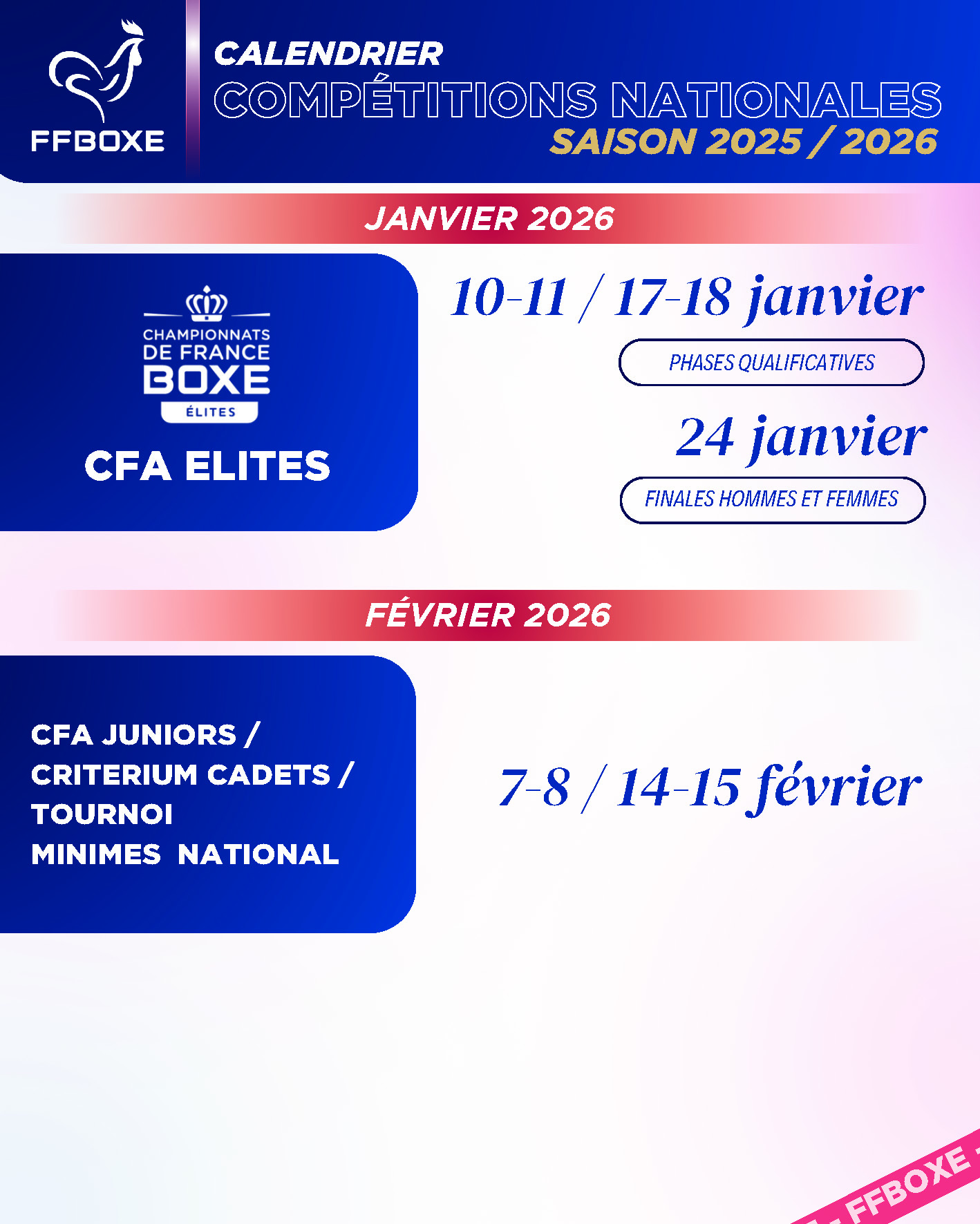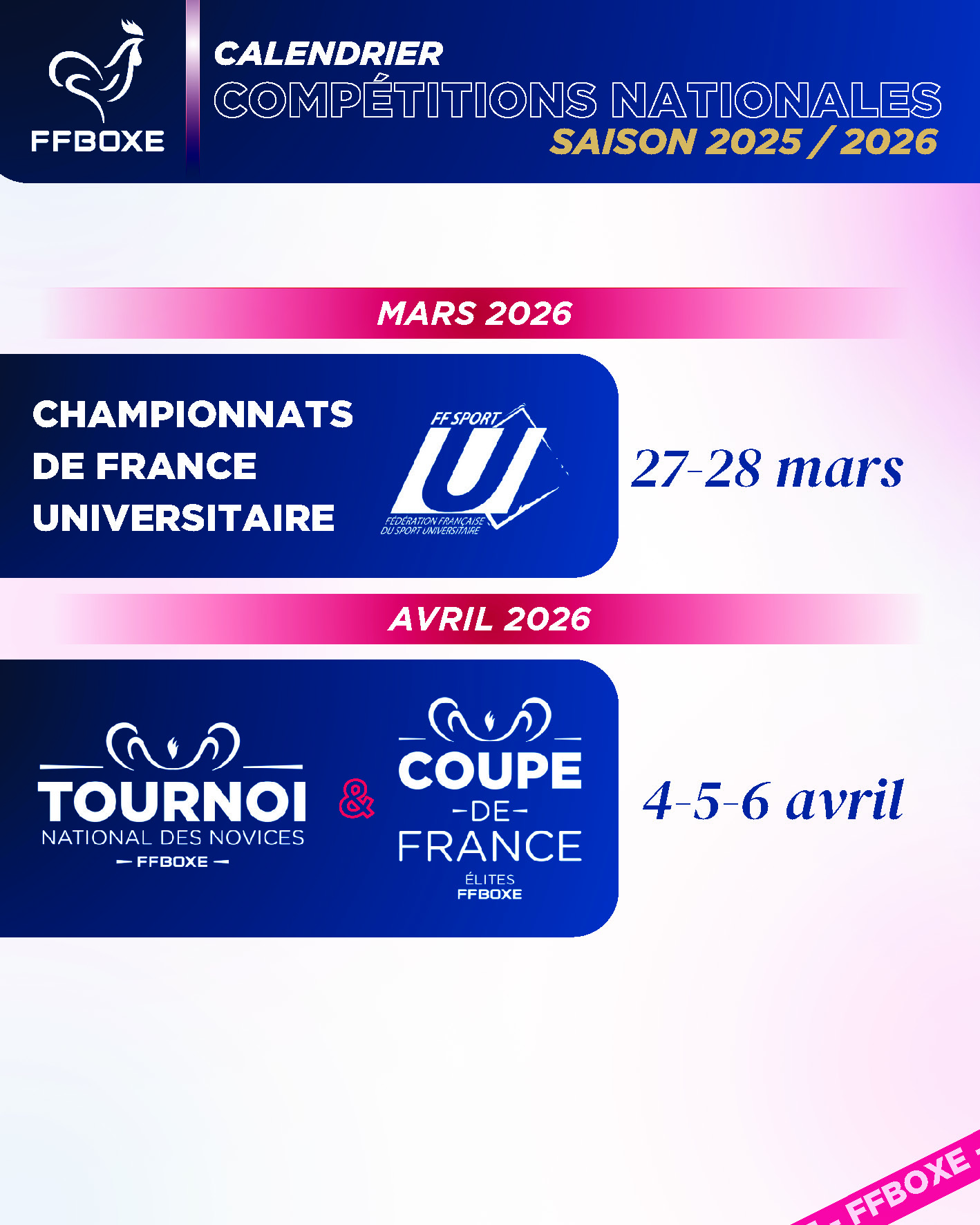 Pour la consultation du calendrier national pour la saison en cours, Rendez-Vous sur le site de la FFBoxe sous actualités / calendrier ou en cliquant sur ce lien :